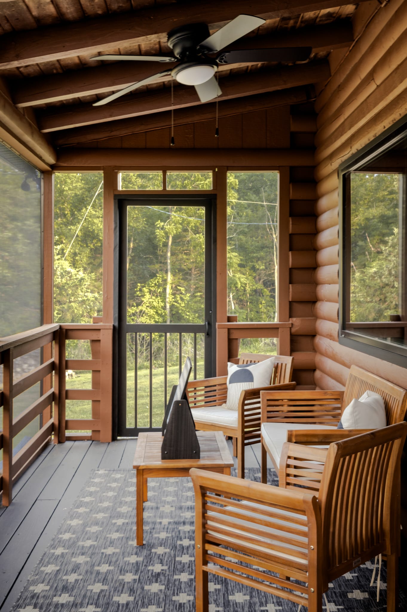 Relish the screened-in porch featuring a spacious swing bed, perfect for unwinding and enjoying the serene surroundings.